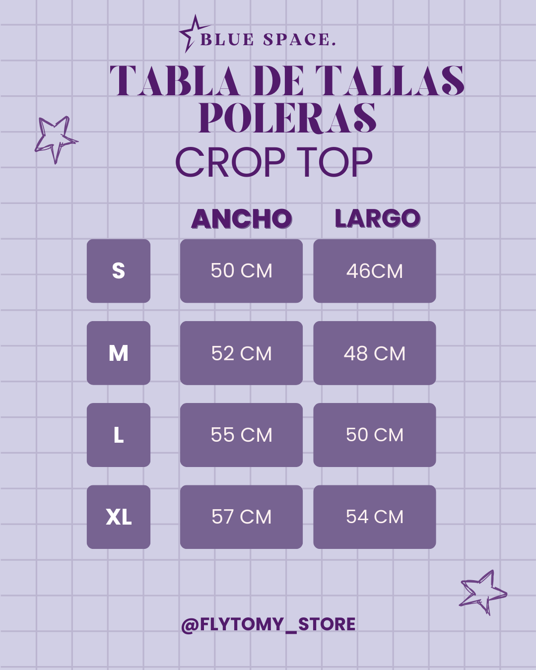 Revisa a continuación las tablas de medida para poleras, ante cualquier duda puedes consultarnos por DM en @flytomy_store